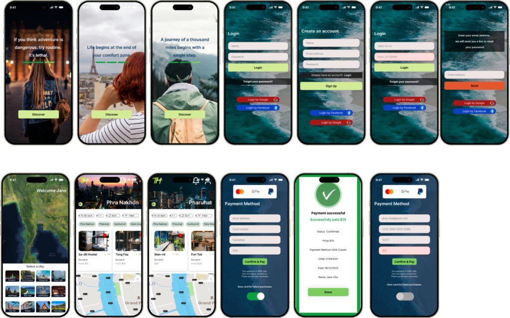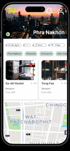 During my trip in 2024, I used the Hostelworld app, which inspired me to imagine an alternative product dedicated to a specific country: Thailand. This concept would allow the future integration of useful travel features such as visa information, weather forecasts, luggage storage locations, simple expressions to communicate easily and cultural rules travelers should not break.